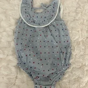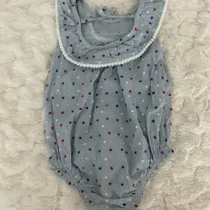 Adorable baby romper with stripes and dot pattern. Features red and blue dots on a white background.