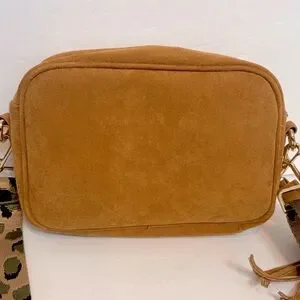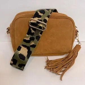 Ah-dorned Tan Faux Suede Leather Zip Top Crossbody Leopard Guitar Strap Bag
