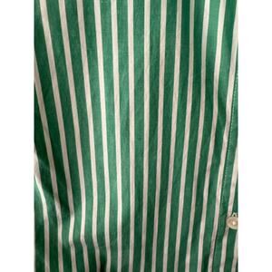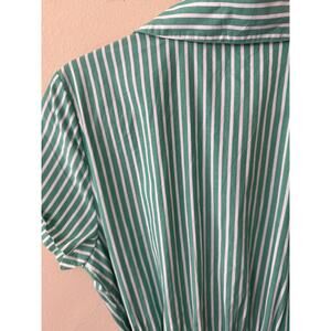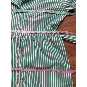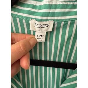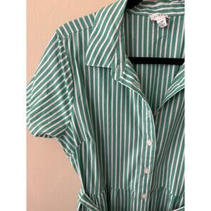 J. Crew green and white striped shirt dress, marked size 12P. Short sleeve, full front button up.