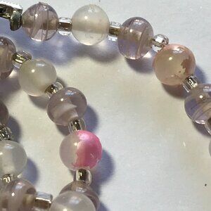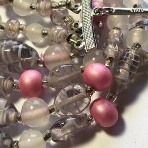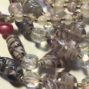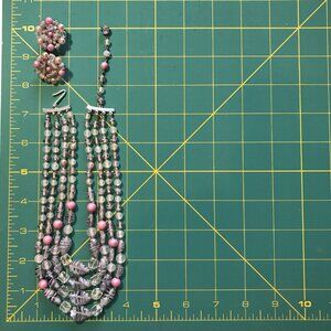 This beautiful vintage set features a necklace with four strands of glass beads and 1" round matching earrings in shades of white, gray, and pink. The beads vary in size and shape and include faceted crystals with an ab sheen, gray and white lampwork beads, round beads with light pink and dark pink coating and small clear spacer beads. The hook and connectors are in very good condition with no discoloration. There is significant peeling of the pink coated beads revealing opaque beads that are possibly plastic.