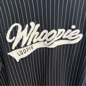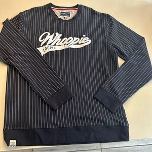 Stylish navy sweatshirt with white stripes and bold 'Whoopie' logo. Perfect for casual wear.