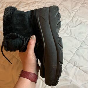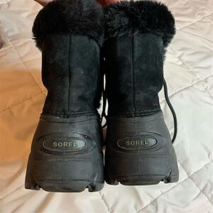 Stay cozy and stylish this winter with the Sorel Women's Snow Angel Snow Boots. Designed for cold weather, these black ankle boots feature a Suede upper and a plush faux fur lining, ensuring warmth and comfort. The Thinsulate insulation and durable lug rubber outsole provide excellent traction and protection against the elements. With a lace-up closure and a round toe shape, these boots are perfect for winter adventures. Pre-owned and ready for a new journey.
