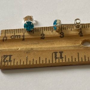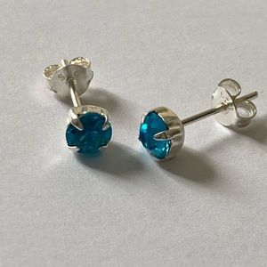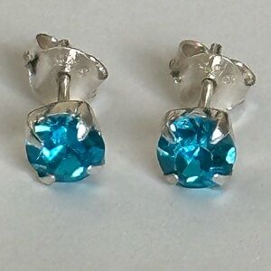 Turquoise blue cubic zirconia stone rhodium plating over 925 sterling silver solitaire post stud about 5 mm earrings for girls , boys , women or men in free gift box