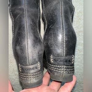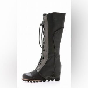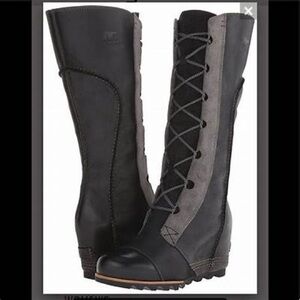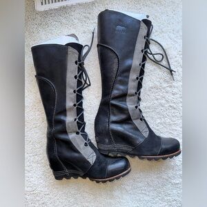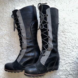 Preloved Cate the Great wedge tall boots in lace up style. SOOO comfortable. Boots show wear but plenty of life left in them. Super cute!! Waterproof. Please inspect photos as they are part of the description. Prepare to be bombarded by compliments! These boots are no longer made by Sorel which make them hard to find.