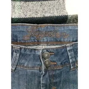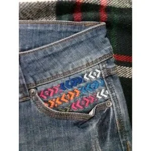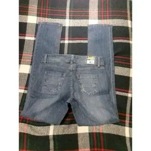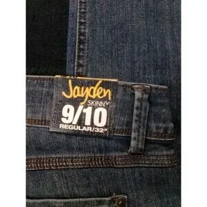 The product is a pair of women's skinny jeans in size 10 regular from the brand Jayden. They feature embroidered accents and have a zip and button closure. The jeans are new with tags and can be machine washed. The color is blue.