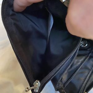 Multi pockets, two with zippers and the middle one with a snap closure. Super clean and bid enough for the essentials. 6” wide and 5” tall, and 1” deep.