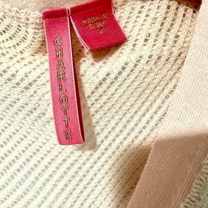 Charlotte Tarantola - baby pink and white lace cardigan with gold buttons