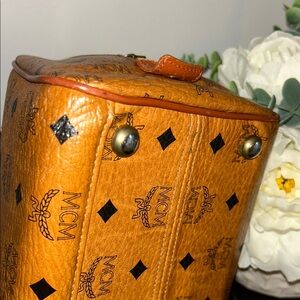Elegant MCM satchel in rich brown leather. Features gold hardware and iconic logo pattern. Perfect for stylish outings.