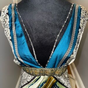 This elegant dress is perfect for cocktail events, showcasing a sleeveless design with a daring plunge neckline. The rich blue and gold hues add a touch of sophistication, while the midi length ensures a graceful silhouette.