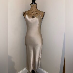 This elegant slip dress features a sleek and simple design. Perfect for any occasion.