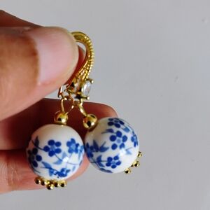 These elegant earrings feature a beautiful blue floral design on a gold setting, perfect for adding a touch of sophistication to any outfit.
