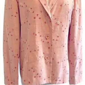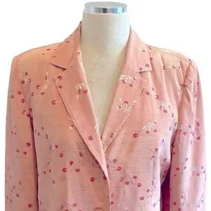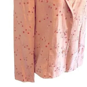 Floral Pink Blazer By Norton McNaughton. This floral blazer is a perfect addition to your spring or summer wardrobe. It features a coral pink color with scattered small magenta flowers throughout. It has a lightweight feel and slight sheen on fabric. Good preowned condition, no notable flaws.