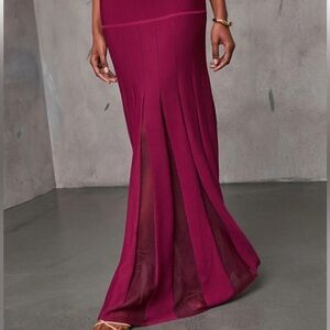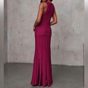 This elegant sleeveless burgundy pleated dress is perfect for any occasion. Its rich color and flowing design offer a sophisticated look.
