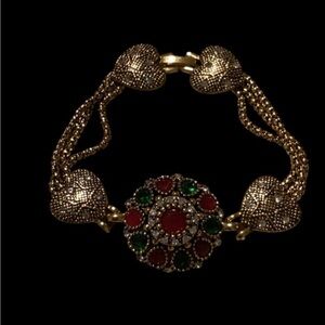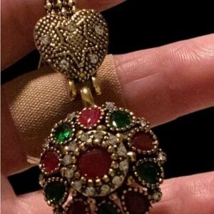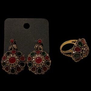 Stunning gold jewelry set with red and green accents. Includes necklace, bracelet, earrings, and ring.