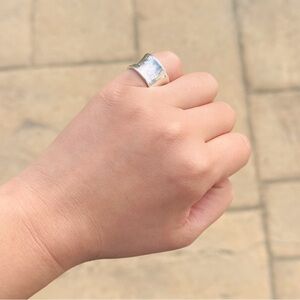 Recently polished and includes a pouch. Best fits a size 5 approx due to the style and measures as a 5.5 on my mandrel. This is a retired heavier version of this ring with a thicker band.