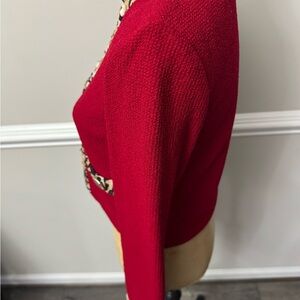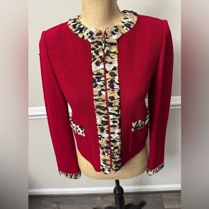St John jacket 2 Stylish red women's jacket featuring a chic animal print trim. Perfect for adding a bold touch to your wardrobe.