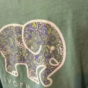 Great medium-weight cotton T shirt———mint green color——-paisley purple and green elephant print on back——really cute——excellent condition