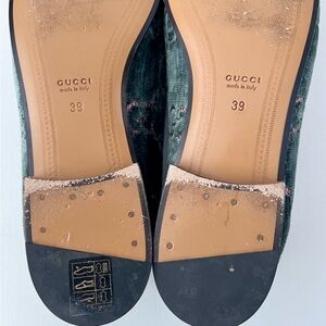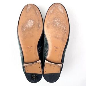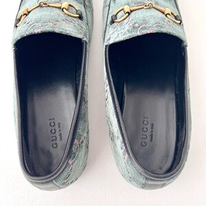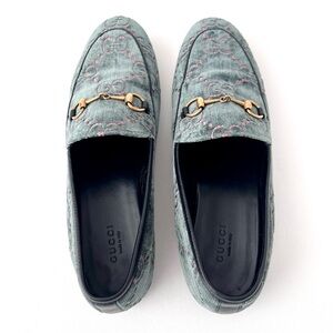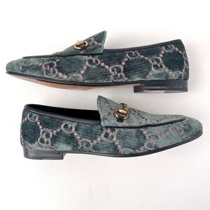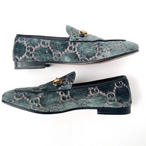 GUCCI | Jordaan Horsebit Velvet Monogram Loafers Flats Green Pink GG Logo US 9