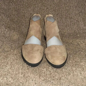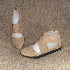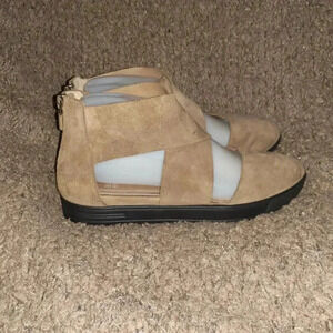EILEEN FISHER-Light Brown Suede Platform Sandals-Back Zip-Sz 7.5-Near Mint