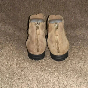 Soft light brown suede uppers with criss cross wide straps and closed almond toe with back zip closure.