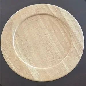 Enhance your dining experience with these elegant natural wood chargers. The warm brown tone adds a rustic charm to any table setting. 13- inches Beautiful preowned condition