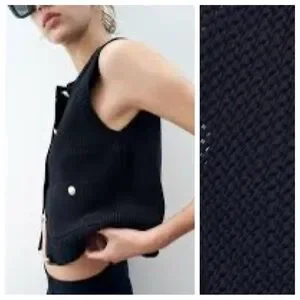 NWT. Zara Navy Blue Chunky Knit Round Neck Top. Front patch pockets. Front gold button closure. Size S. Ref. 5802/112. Pit to pit 20" flat, shoulders 17,5", length 22". 1074