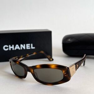 Chic Chanel Tortoise Shell Sunglasses, featuring a slim square shape frame and the gold cc logo on both sides. Perfect for any occasion, these sunglasses offer a blend of luxury and elegance.