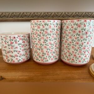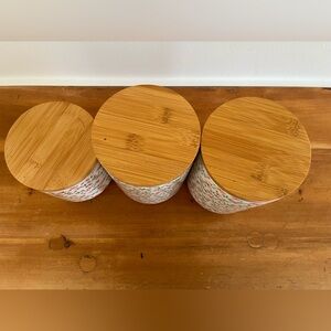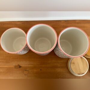 SET OF (3) FLORAL STONEWARE CANISTERS W. WOOD COVERS