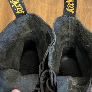 Classic Dr. Martens black leather boots with lace-up design. Iconic yellow stitching.