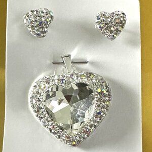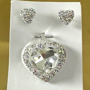This dazzling silver set features heart-shaped earrings and a matching pendant, crafted with intricate detailing and a radiant finish.