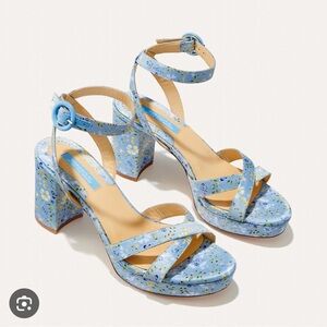 floral block heels, blue sandals, ankle strap sandals, spring fashion, wedding guest shoes, vintage-inspired heels, floral footwear, chic summer shoes.