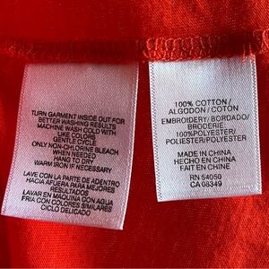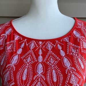This is a vibrant short sleeved knit pullover top from Jones New York Sport, ladies size Large. The soft fabric, 100% cotton, is reddish orange. Features a rounded neckline and a Boho/Aztec pattern embroidered in white. Pairs well with white pants, shorts, skirt…..anything (!), or your favorite jeans, for a casual look!