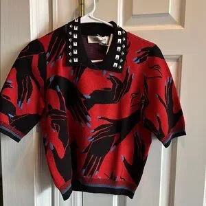 Diane Von Furstenberg knit top with a striking red and black graphic design. Features a graphic studded collar for added edge. NWT
