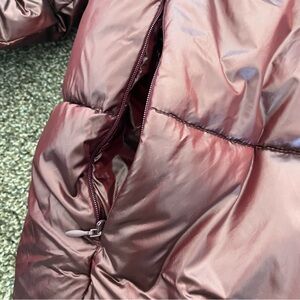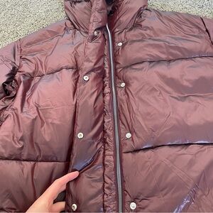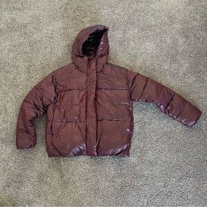 Stylish burgundy puffer jacket with a hood. Perfect for cold weather.