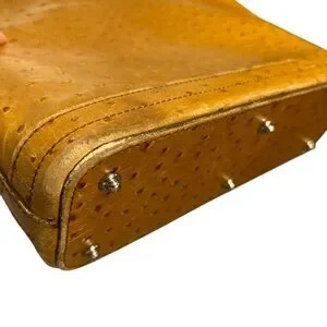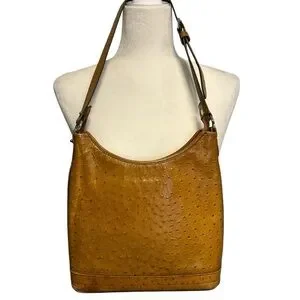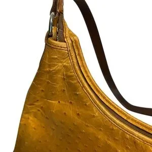 Vintage Y2K Dooney & Bourne Small Hobo Bag Ostrich. This Dooney & Bourke small hobo bag is a stylish addition to any outfit. The exterior is made of ostrich leather in a beautiful tan color, while the interior is lined with beige fabric. The bag has a zip closure and a leather handle/strap in a matching tan color. The hardware is silver in color, adding a touch of elegance to the design.