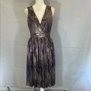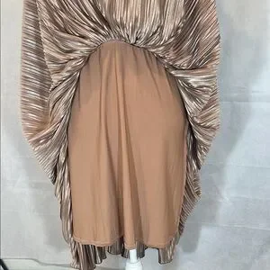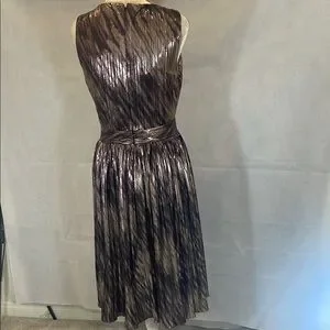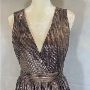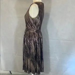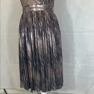 This stunning cocktail dress features a sleeveless design with a plunging V-neckline, perfect for making a statement. The pleated A-line skirt adds a touch of elegance, while the gold and brown hues create a luxurious look. Ideal for cocktail parties, this dress is both sophisticated and eye-catching. The zipper is Back Center appx 21” , LENGTH appx 42” , Waistline appx 28” , Armpit to Armpit appx 16” .