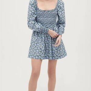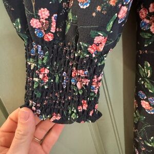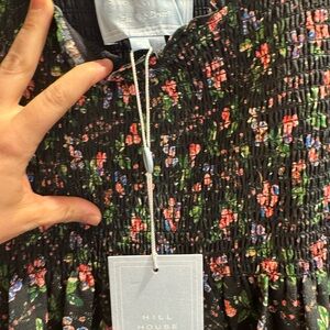 Mini floral dress with smocked bodice. Features long sleeves cinched at wrist. Attached is a photo of the dress in a different color to see length, it is short. Has pockets! Fully lined, beautiful as always from Hill House Home.