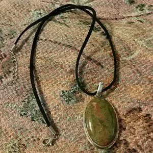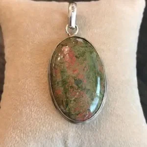 This is a beautiful and large 925 and Unakite pendant necklace. Bail is marked 925. It is said that Unakite is used for healing, balance, and release bad habits. Promotes patience, persistence and growth of healthy tissue. Releases negative thought patterns. Measurements and weight are pictured.