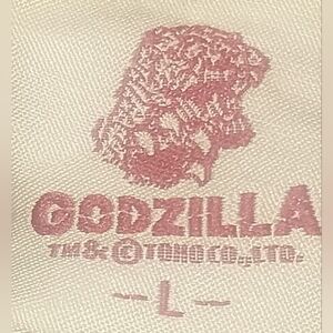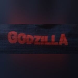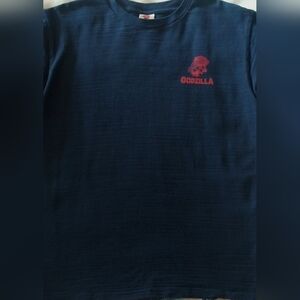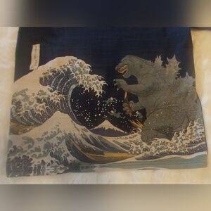 Navy t-shirt featuring a Godzilla graphic with waves. Bold and unique design.