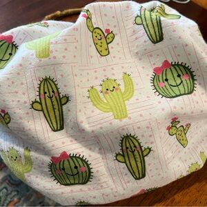 OOAK handmade by me!!! Handbag has bamboo handles, super cute cactus lining. Approx 13” long from top where crochet meets handles, 16” side to side.