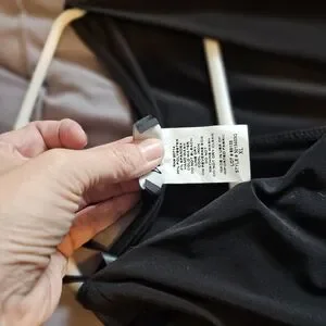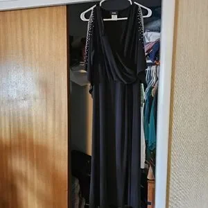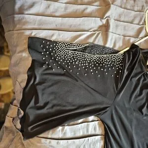 This elegant black dress is perfect for any occasion. Its sleek design offers a timeless look. Cold shoulder sleeves with sparkly rhinestones. It's been in my closest for over a year. It just didn't look good on me but it is a very pretty dress.