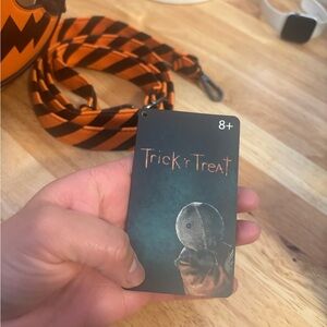 Round crossbody bag with a pumpkin face design. Features orange and black colors. Includes a matching strap. used a few times in good condition comes with crossbody strap