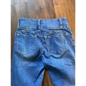 Wax Jeans But, I Love You in a size 7. They have a nice stretch for a very comfortable fit. Medium blue color. 70% cotton / 26% polyester / 2% spandex / 2% rayon.