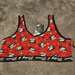 Vibrant red bralette featuring Minnie Mouse design. Perfect for Disney fans.