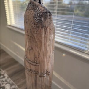 This elegant cream dress features intricate beading, perfect for special occasions. Its sophisticated design offers a timeless look.
