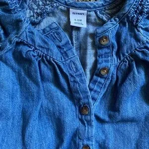 Adorable blue denim baby romper with button details. Perfect for casual outings.