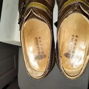 Elevate your style with these sophisticated olive/brown leather double monk strap shoes. Perfect for any formal occasion. In good condition. see pictures.