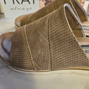 Comfortable slip-on sandals. Perforated design. Ideal for casual or weekend wear. Sophisticated classy feminine neutral.