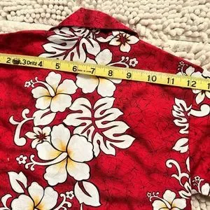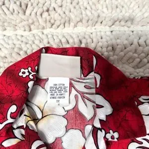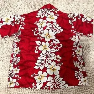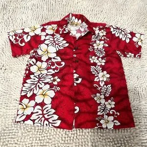 Winnie Fashion Traditional Hawaiian Aloha Hibiscus White on Red Boys Size 6 Button Up Shirt. Finished seams and turned collar. 100% cotton. Size 6. Length from back of neck to hem 17.25”. Waist 28”. Sleeve length 5.25”. Like new pre-owned condition. Made in Hawaii USA. No tears, rips or flaws.