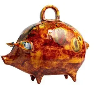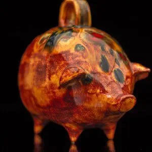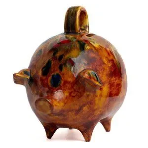 Vintage Handcrafted Ceramic Piggy Bank With Handle and Abstract Glaze Design